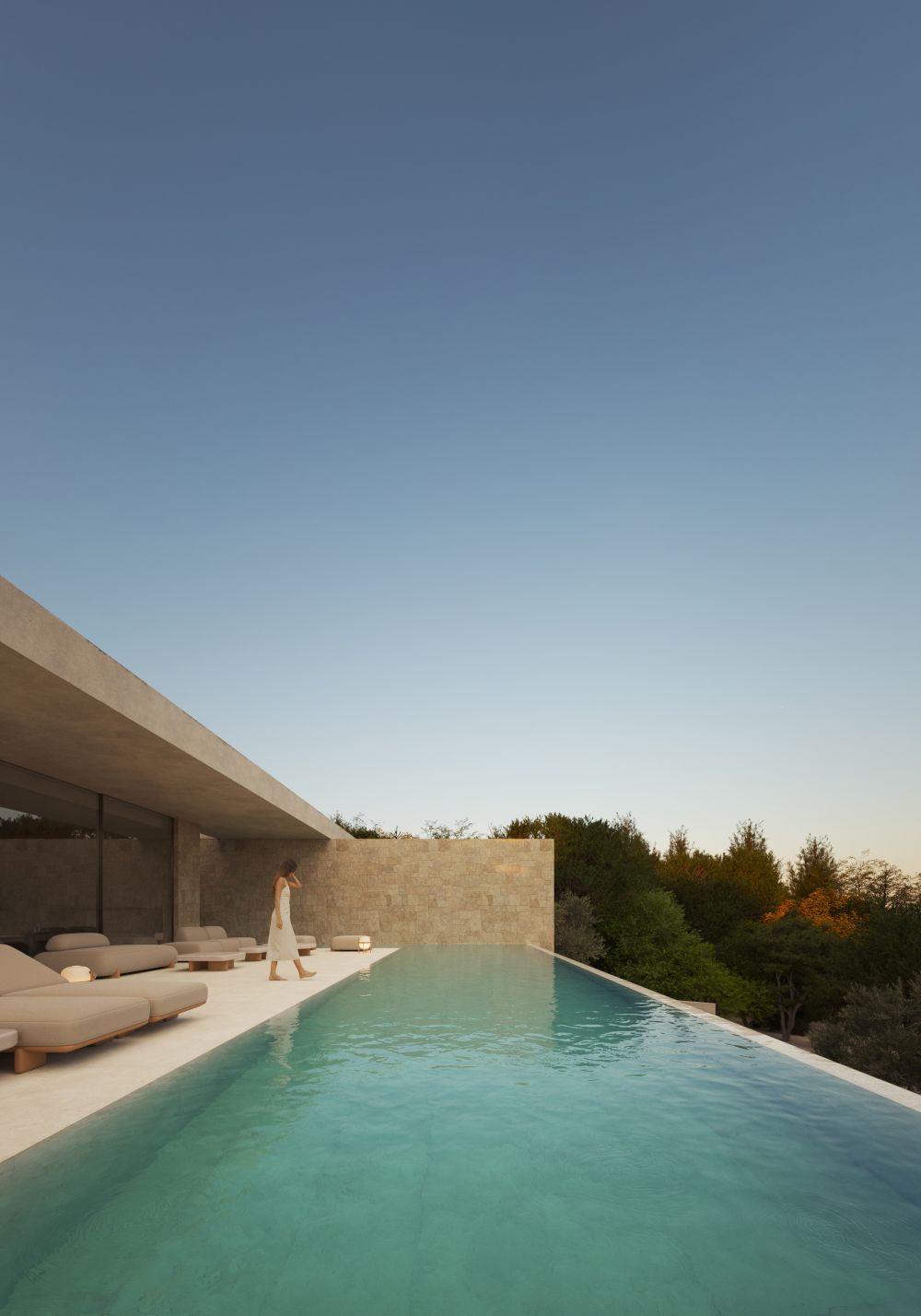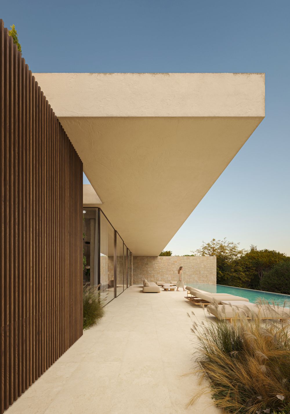 Projected entirely in A single floor, the house stands out for its architecture of clean lines and open spaces. Thanks to its imposing floor-to-ceiling windows, the interior integrates perfectly with the landscape, flooding each room with natural light and connecting the living room with the generous outdoor terraces.