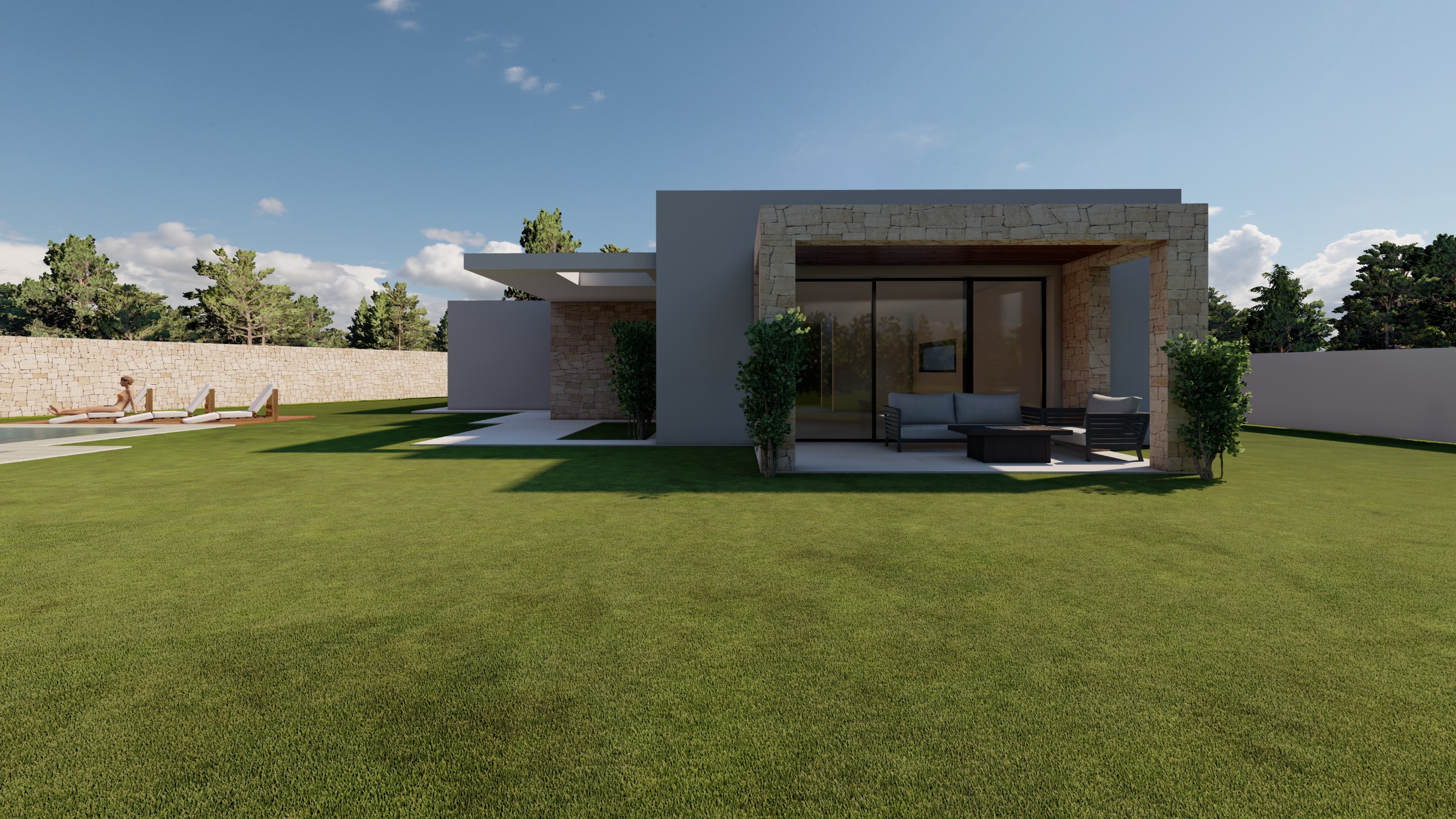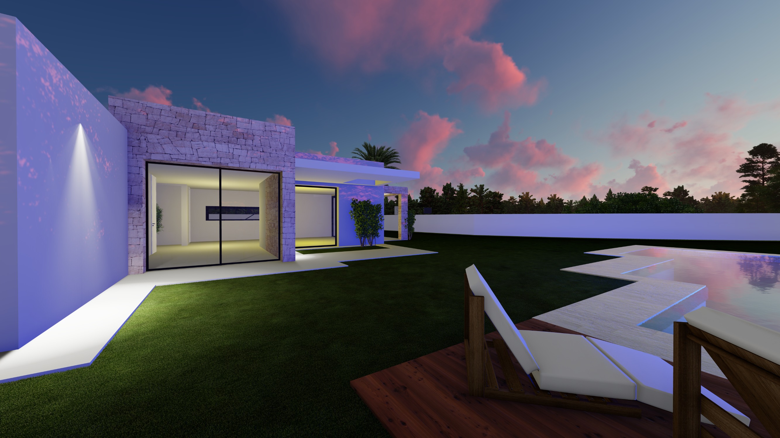Conçue sur un seul niveau, la villa dispose d’un vaste salon-salle à manger avec cuisine intégrée, baigné de lumière grâce à de grandes baies vitrées. Elle offre 3 chambres et 2 salles de bains, chaque espace étant pensé pour optimiser le confort, la lumière et les vues.