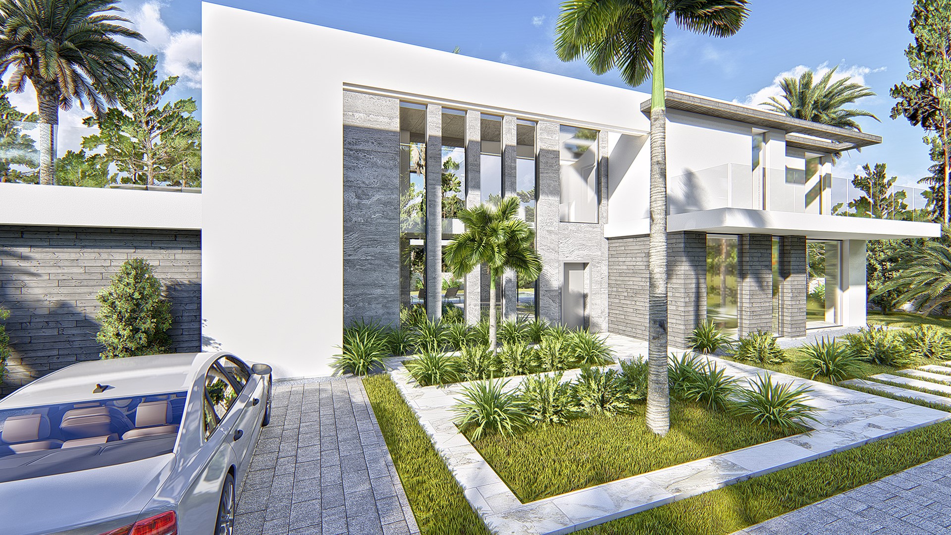 Cette villa allie design contemporain et éléments classiques, avec de grandes baies vitrées offrant lumière naturelle et vues sur le jardin.