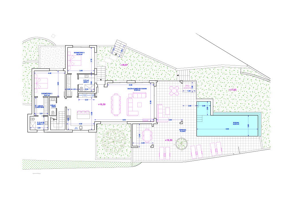 Distribuida en tres niveles, dispone de amplios espacios luminosos, 4 dormitorios, 3 baños y una cocina abierta al salón con acceso directo a la terraza y piscina privada.